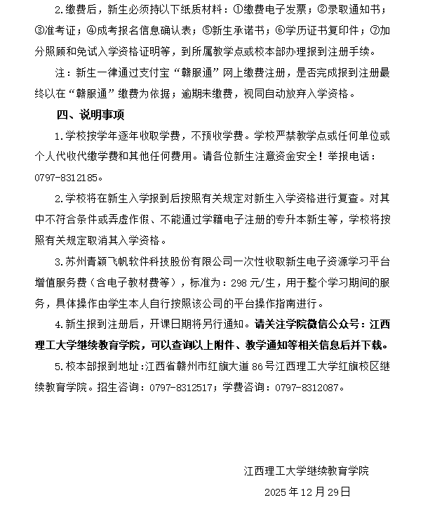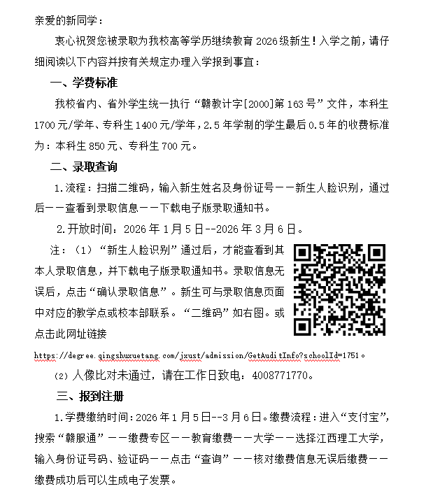 江西理工大学高等学历继续教育2026级新生入学须知
