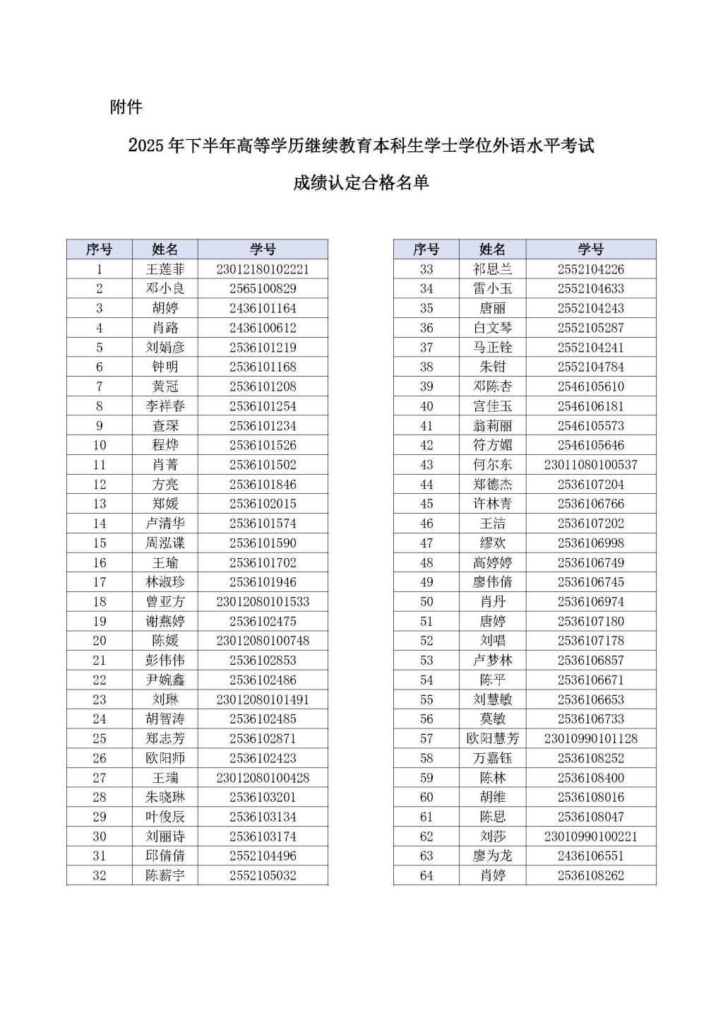 附件:2025年下半年高等学历继续教育本科生学士学位外语水平考试成绩认定合格名单